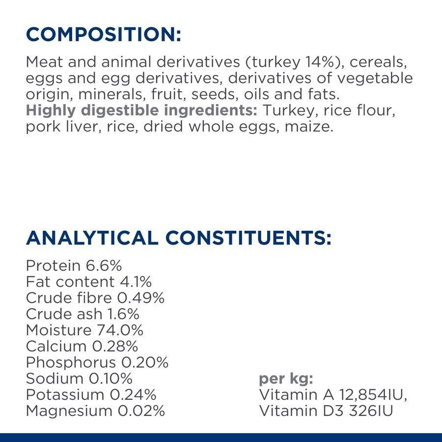 Hill's Prescription Diet Canine i/d Digestive Care - Turkey has been specially developed for dogs with digestive tract conditions or acute absorption issues in the gut. The highly-digestible wet food is enriched with electrolytes and B-vitamins, helping to balance nutrient insufficiencies and improve nutrient intake. It is made with the unique Hill's ActivBiome+ Technology, a special mix of prebiotic fibres that are clinically proven to improve the microbiome in the gut and ensure optimum stool consistency and healhty digestion. Hill's Prescription Diet Canine i/d Digestive Care - Turkey is suitable for dogs with gastrointestinal issues, oesophogeal conditions, stomach ulcers and problems with inadequate digestion. It is ideal for acute care or recovery, as well as being a great choice for puppies or overweight dogs. This special Hill's Prescription Diet Canine i/d Digestive Care - Turkey contains a balanced mix of vitamins, minerals and omega-3 and -6 fatty acids. This helps to support your dog's vital functions and develop a strong immune system. A high-quality food prescribed by vets and helping to effectively regulate your dog's digestion and bring the intestinal system into balance.