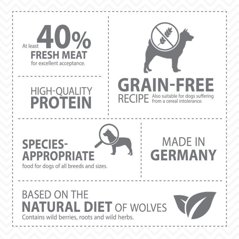 - Based on the natural diet of wolves living in the wild: for young dogs of all breeds and sizes