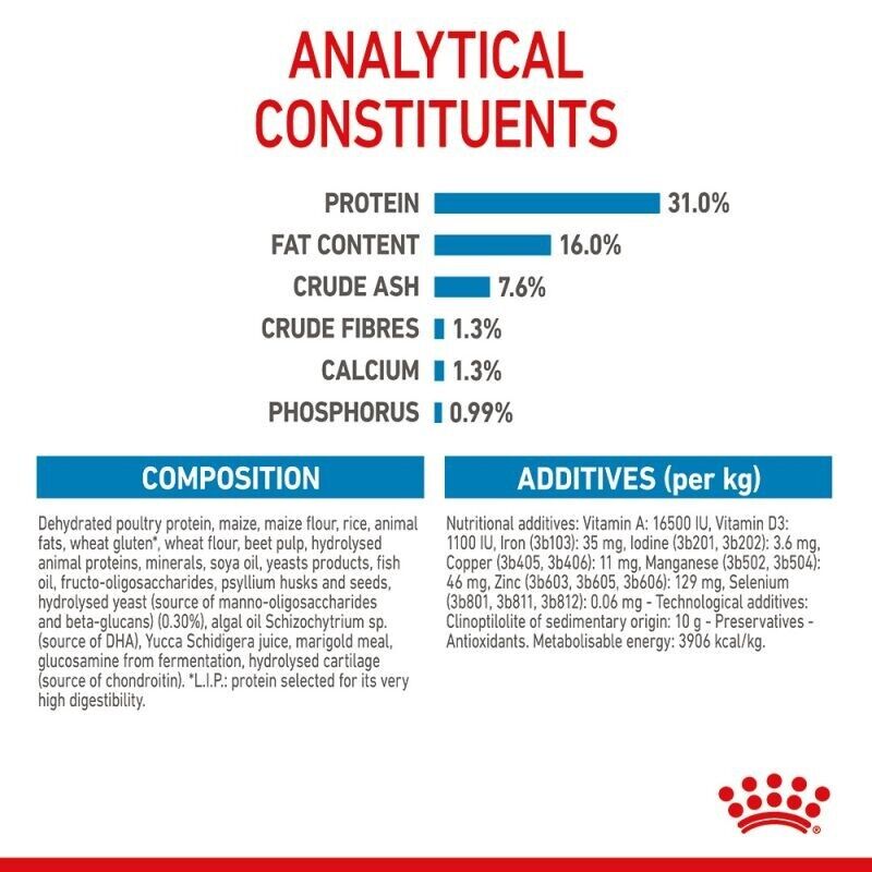 Dried poultry protein, maize, maize feed meal, rice, animal fat, wheat gluten feed*, wheat feed meal, dried beet pulp, hydrolysed animal protein, minerals, soya oil, yeast by-products, fish oil, fructo-oligosaccharides, psyllium [husks and seeds], hydrolysed yeast [source of mannan-oligosaccharides and beta-glucan] (0.3%), algae oil Schizochytrium sp. [source of DHA], juice from Yucca schidigera, marigold meal, glucosamine from fermentation, hydrolysed cartilage [source of chondroitin].
